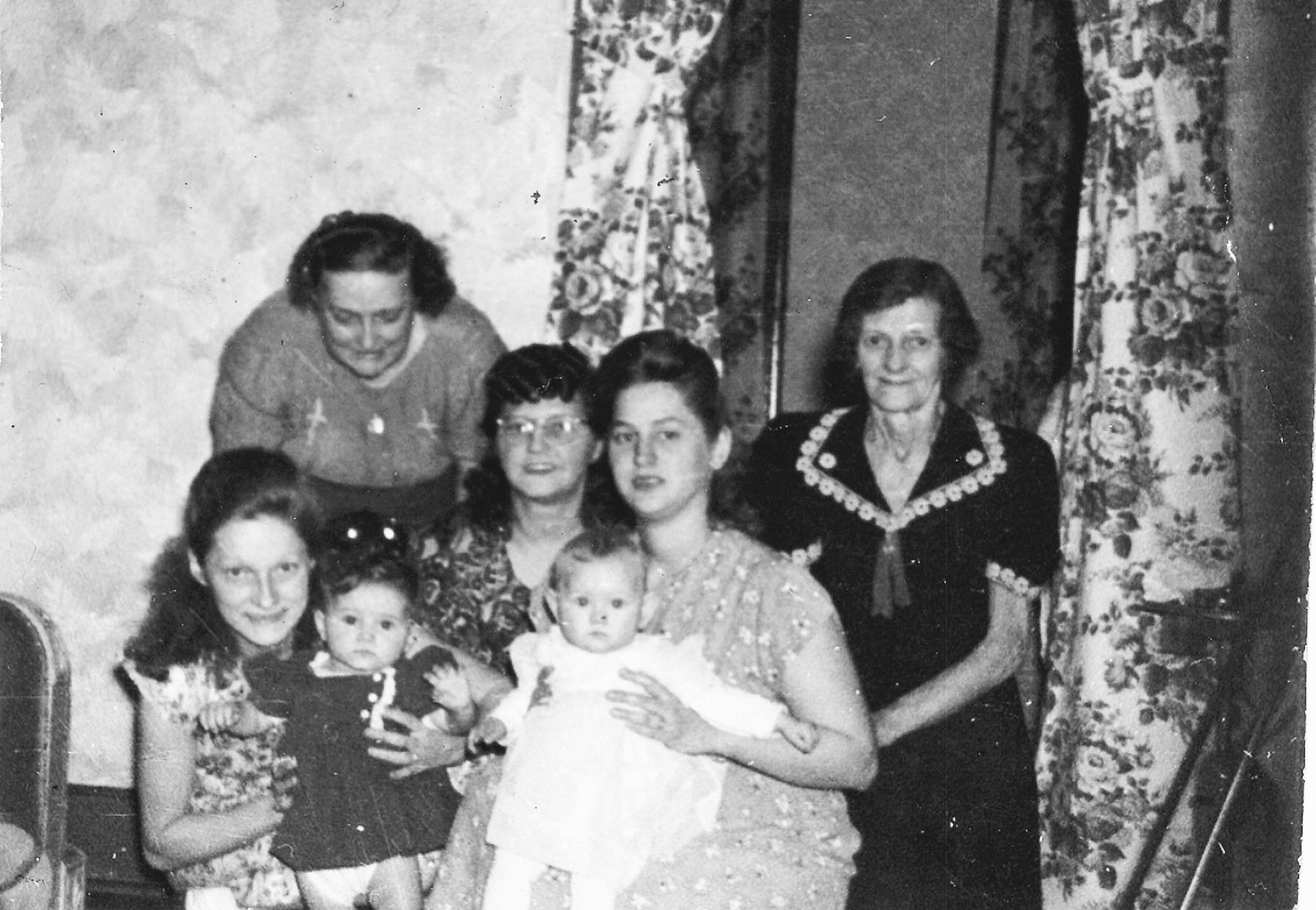 Four generations: left front: ma, me, Judy Pora, Flo Pora. left rear: Grandma Taraba, Auntie Rosie Pora and Gr-Grandma Bonder.